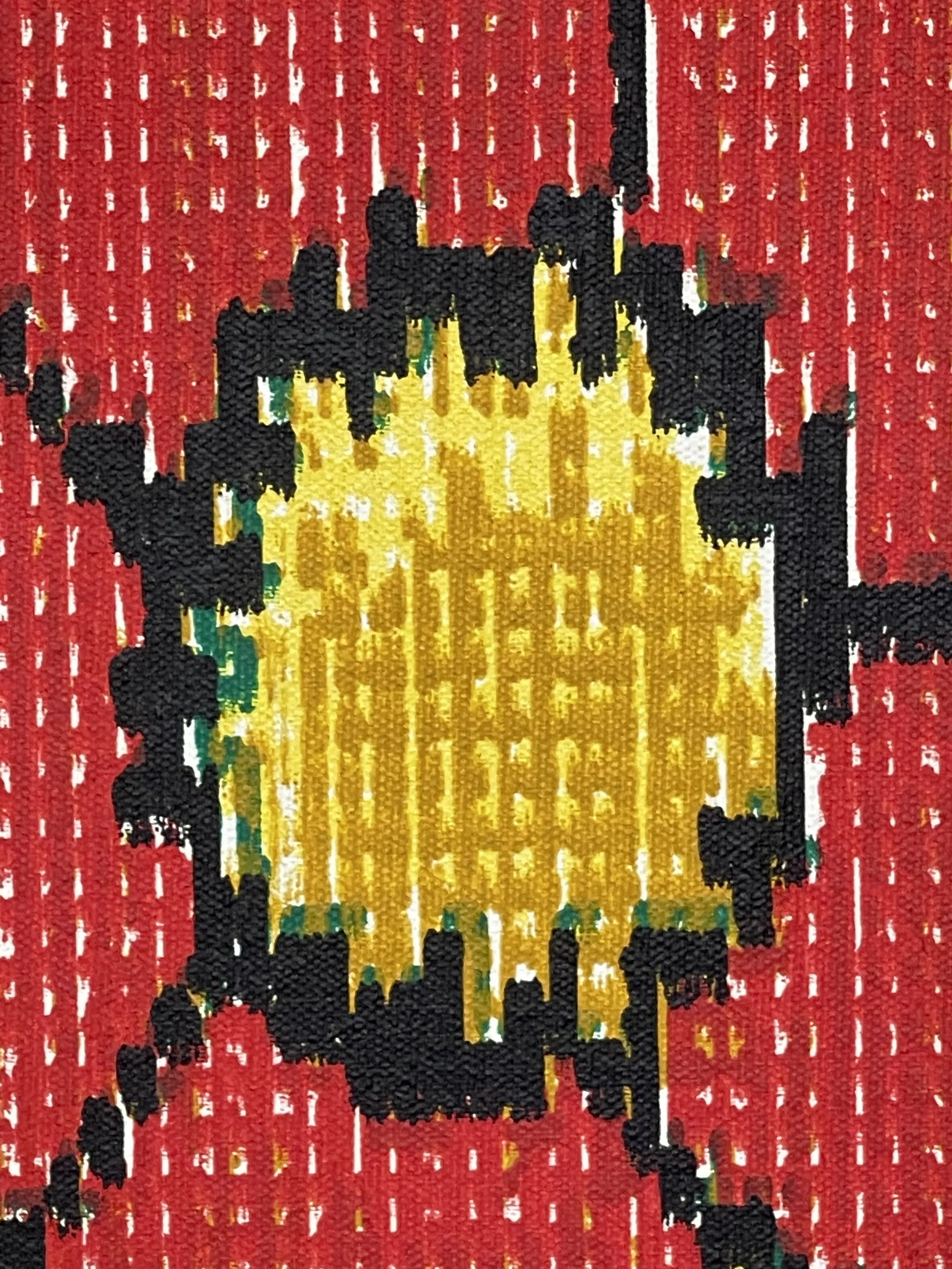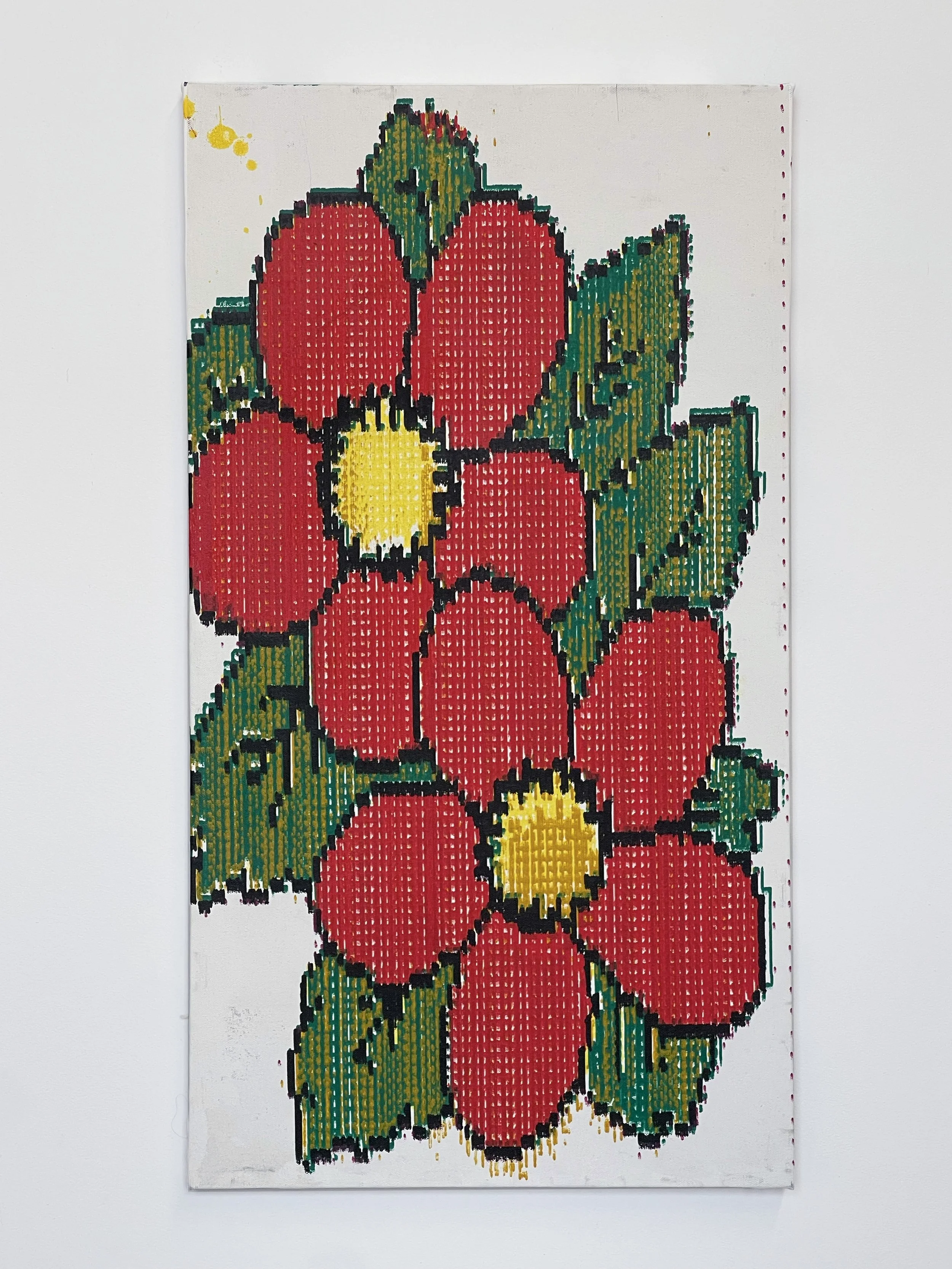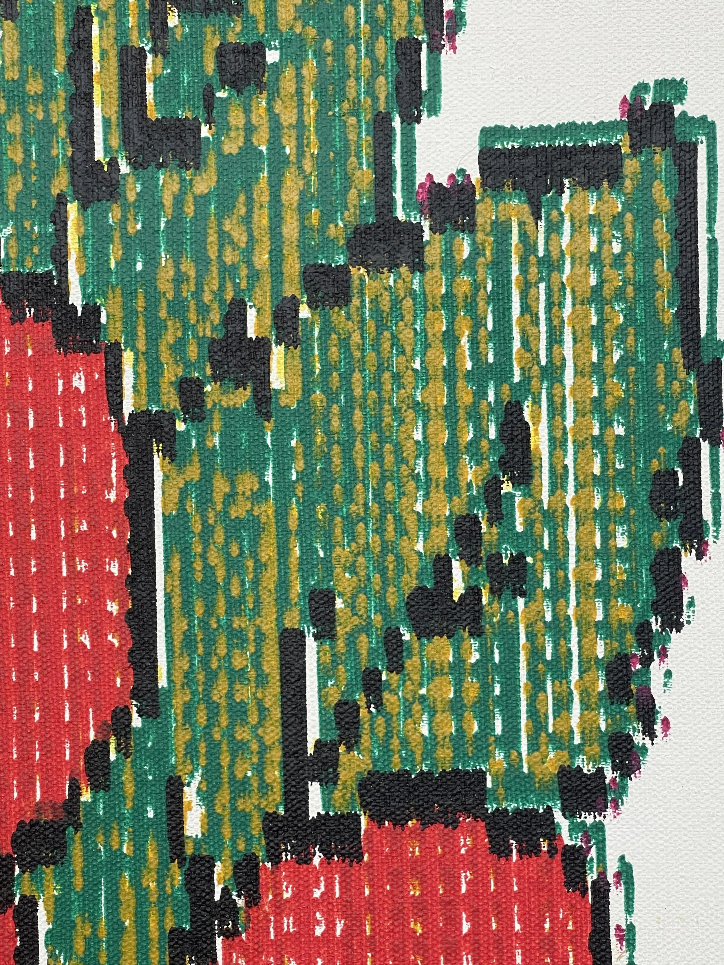 Each piece is made using pen plotters and custom-built machines. These machines hold pens, brushes, or paint markers and apply color one dot, line, or mark at a time. The process is both mechanical and painterly, mixing analog patience with digital precision.